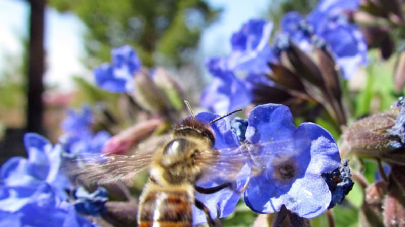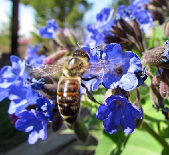 Я перешёл к следующему первоцвету – медунице. Люблю этот цветок. Он распускается даже раньше наших подснежников-прострелов, а смотрится не отдельным цветком, а целым букетом. В детстве мы эти цветы медунками называли. Медуница, медунка – названия не случайные. Если выдернуть из соцветия отдельный цветочек и пососать его – даже сладость чувствуется, так много в нём нектара. Медуницу и есть можно. И цветы, и цветоносы, если их чуть-чуть почистить. Во всяком случае, мы в детстве ели. И ничего. Но сейчас мне важнее не то, что медуницу можно съесть, а то, что она хороший медонос. Значит, на ней будут пчёлы. А цветок с пчёлами на фотографии смотрится интереснее, чем просто цветок.