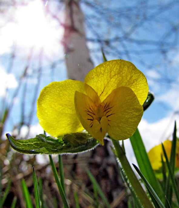 Нашёл на своём участке под берёзой дикую жёлтую фиалку. Ма-аленькая такая симпатяжка, но очень яркая, потому что солнце цветок насквозь просвечивает. Ползаю я вокруг неё на коленках, ракурс для фотосъёмки выбираю. Скрючился весь. Уже не только на коленях, но ещё и на локти встал, фотоаппарат поближе к цветочку пристраивая. Безлюдье вокруг. Индекс режима самоизоляции, пожалуй, на пятёрку тянет: кроме меня в округе никого. Тишину даже птичье пение не нарушает. И вдруг чувствую на себе чей-то взгляд. Вроде даже не человеческий. Не враждебный, а наоборот – чуть боязливый и очень любопытный.