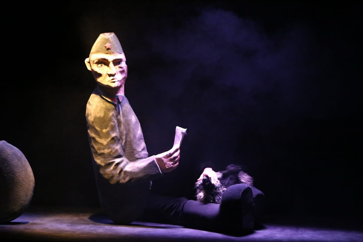 Третий спектакль был в Краснодаре, делали мы его с Романом Вильчиком, художником спектакля «Возвращайся!». Спектакль назывался «Другими глазами войны», он был посвящён животным Великой Отечественной войны, которые воевали рядом с человеком. В основном это собаки, но были и верблюды, и мыши противотанковые, и лошади. Нам хотелось показать, что эта мясорубка втягивала и тех, кто не имеет права голоса. Мы ставили спектакль о том, что люди не спросили своих братьев меньших, хотят ли они идти на эту войну или не хотят. Поскольку животные не разговаривают, мы не можем сказать, что они понимают и чувствуют. Но я, как владелица овчарки, знаю, что у овчарки к концу жизни словарный запас – как у пятилетнего ребёнка. И то, что на эмоциональном уровне собака чувствует все переживания, помимо того что она существует ещё и в системе условных и безусловных рефлексов. Это такой момент, по поводу которого в Краснодаре возникли двоякие суждения. Кто-то нас поддержал, а кто-то говорил: «Что вы тут про собачек? Вы кощунственно относитесь к памяти умерших солдат». Но это тоже живое существо, были собаки-минёры, собаки-сапёры, собаки-санитары… Эти животные бок о бок прошли всю войну, спасли кучу человеческих жизней. Наверное, стоило бы про это почитать и ознакомиться с дневниками кинологов, для которых животные были как дети.