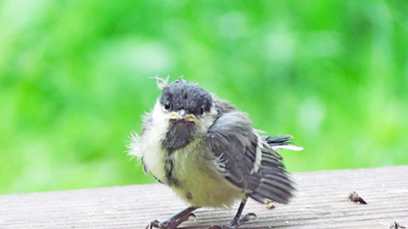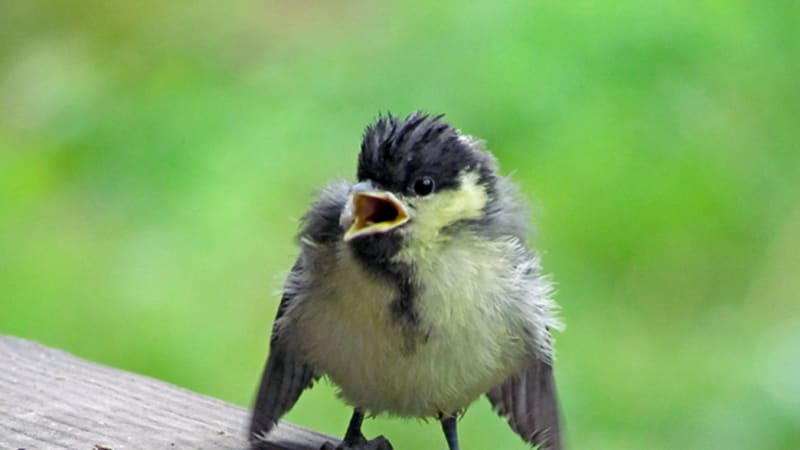 И то ли по молодости и неопытности, то ли от погодной безысходности привели синицы свой выводок на… недостроенную террасу моего садового домика, под крышу. На то, что я тут хожу туда-сюда, – ноль внимания. И никаких криков «Бойся!» своим ребятишкам, к которым я с фотоаппаратом лезу. Слётки и не боятся. Я аппарат почти вплотную к жёлтому рту подношу, а слёток, вместо того чтобы перепорхнуть или бегством спасаться, с интересом его рассматривает. Тут же то ли их маманя, то ли папаня (я их так и не научился узнавать) подлетает и что-то быстро-быстро в распахнутый жёлтый рот заталкивает. Я даже увидеть не успеваю, что за еда пацану досталась. А родитель, неловко развернувшись, мокрым хвостом – прямо по объективу. Мощный шлепок получился. Приходится вытирать, подсушивать стекло, чтобы незапланированные съёмки продолжить.