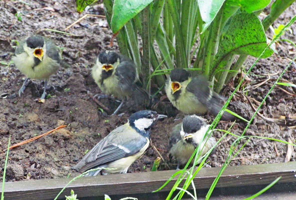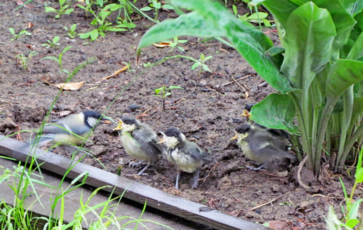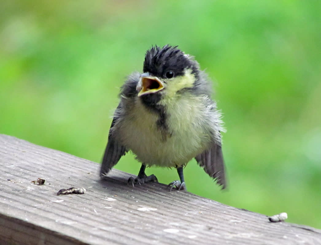 И то ли по молодости и неопытности, то ли от погодной безысходности привели синицы свой выводок на… недостроенную террасу моего садового домика, под крышу. На то, что я тут хожу туда-сюда, – ноль внимания. И никаких криков «Бойся!» своим ребятишкам, к которым я с фотоаппаратом лезу. Слётки и не боятся. Я аппарат почти вплотную к жёлтому рту подношу, а слёток, вместо того чтобы перепорхнуть или бегством спасаться, с интересом его рассматривает. Тут же то ли их маманя, то ли папаня (я их так и не научился узнавать) подлетает и что-то быстро-быстро в распахнутый жёлтый рот заталкивает. Я даже увидеть не успеваю, что за еда пацану досталась. А родитель, неловко развернувшись, мокрым хвостом – прямо по объективу. Мощный шлепок получился. Приходится вытирать, подсушивать стекло, чтобы незапланированные съёмки продолжить.