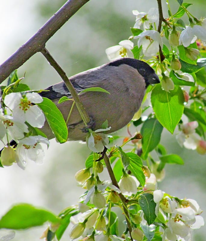 Певчих птиц у нас в Сибири, судя по научной литературе, очень много. Правда, не все певчие умеют петь. Некоторые лишь попискивают или поскрипывают, в лучшем случае хотя бы посвистывают. Как и звёзды человеческого шоу-бизнеса. Мне кажется, что по-настоящему хорошо на отдельно взятом моём дачном участке поют только горихвостки. Мне доводится их слушать хоть и не часто, зато с большим удовольствием. Вот и на прошлой неделе ночью довелось послушать. Судя по мастерству – пел самец. Орнитологи полагают, что самцы не только внешне ярче самок, но и поют особенно красиво. Поэтому днём после концерта, заметив боковым зрением что-то красное в мелькнувшей мимо птице, я ни на йоту не усомнился, что это был самец горихвостки. Рассмотреть птицу не успел, но заметил, что скрылась она в густой кроне соседской груши, растущей почти вплотную к моему участку. Сходил за фотоаппаратом и стал внимательно всматриваться в листья. Вдруг – глазам своим не верю: среди листьев и уже осыпающихся цветов сидит… снегирь! Да, самый настоящий и самый что ни на есть зимний снегирь. Летом!