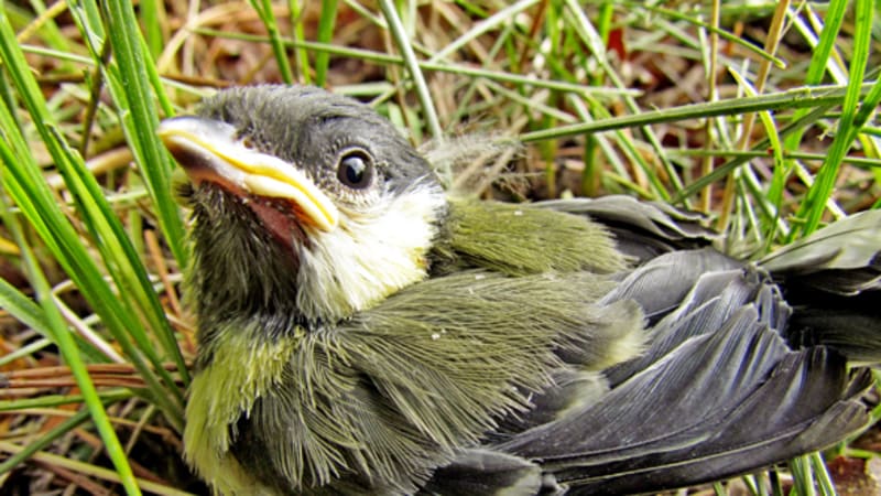 Фотографирую птенчика, встав на колени, а он не понимает, что я его вижу. Затаился. Но глаза открыты. Взгляд ясный. Внешних повреждений не видно. На растущих пёрышках крови нет. Выглядит вполне здоровым.