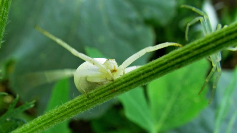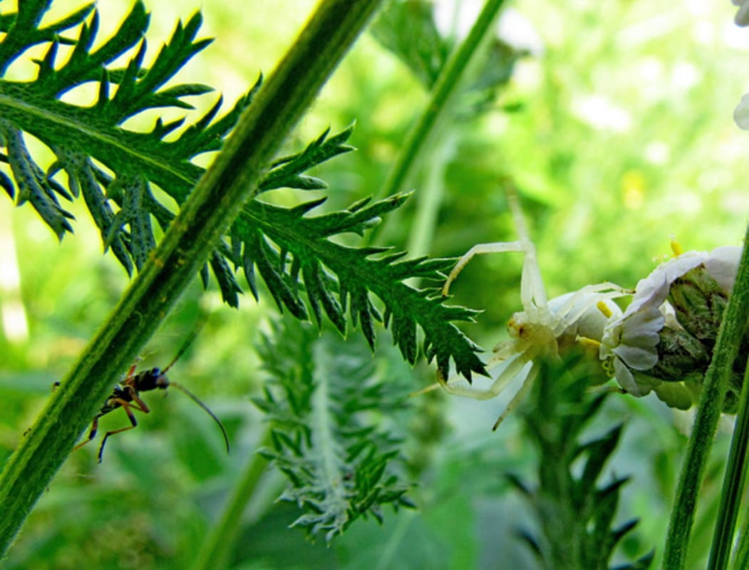 Только спрятаться от меня непросто. Оставив котелок в качестве ориентира, я в дом – за фотоаппаратом. Вернувшись, внимательно всматриваюсь в зелень, пытаясь увидеть белую «горошинку». Пусто. Осторожно отвожу в стороны травинки, приподнимаю листочки – нет никого. Почти отчаялся, и вдруг – опа-на. А чудо-то уже не внизу, а на самой вершинке тысячелистника сидит вплотную к цветам. На четырёх лапках держится и ещё четыре, будто руки, веером перед собой и в стороны выставило. Не шелохнётся. То ли молится, то ли медитирует. От охотничьего азарта у меня аж дыхание перехватило. Медленно-медленно, чтобы не спугнуть, приближаю к цветочному «йогу» объектив. Ближе, ближе… А солнце жарит. Зрение и без того немолодое, а тут ещё пот глаза щиплет. Кадр. Второй. Третий… Замечаю, что снимаю пустое место. Солнечных пятнышек много, а восьминогого чуда нет. Когда и куда исчезло? Ага, вон оно, под листком солнечным бликом притворилось.