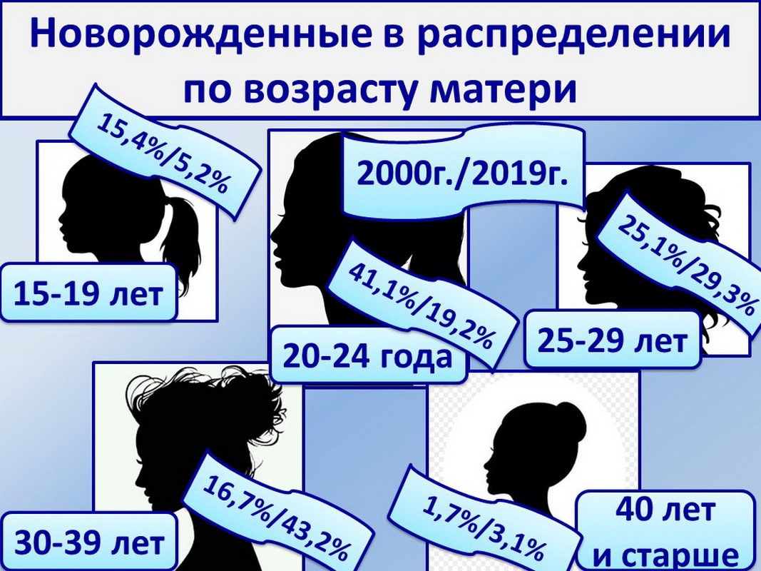 Из всех женщин, родивших ребёнка в минувшем году, 19% были в возрасте от 20 до 24 лет, 5% – до 20 лет (в 2000 г. доля молодых мам была в 2-3 раза больше). Но и ранние роды случаются. В Иркутской области ежегодно фиксируются случаи рождения ребёнка юной мамой в возрасте 14-15 лет, иногда даже в 13 лет. Все дети мам, не достигших 16-летия, рождаются вне зарегистрированных браков. И у 16–18-летних мам большинство рождённых ими детей являются внебрачными. Причём большая часть детей 18-летних мам были зачаты ими до совершеннолетия. В таком юном возрасте некоторые женщины успевают родить двух или даже трёх детей, причём и второй ребёнок, и даже третий могут быть рождены вне брака.