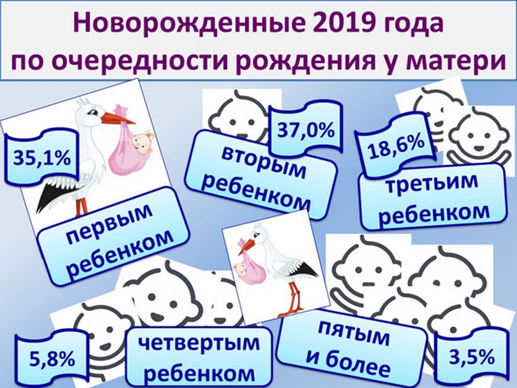 О Приангарье хочется рассказать подробнее. Мальчиков традиционно рождается больше (в 2019 г. – 51,5% от общего числа количества новорождённых). Из числа малышей, родившихся в минувшем году, чуть больше трети (35,1%) были первенцами, 37,0% – вторым ребёнком у мамы, 18,6% – третьим, 5,8% – четвёртым, 3,5% – пятым и более. По сравнению с 2000 г. заметно вырос удельный вес родившихся вторым и последующими детьми в семье. Значительная доля детей (в 2019 г. – 29%) рождается вне зарегистрированного брака.