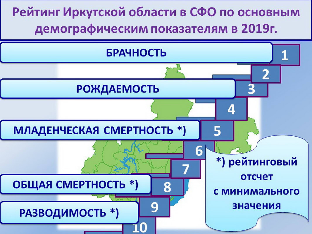 А каково положение в разных регионах? Как выглядит Приангарье на фоне других сибирских территорий? В рейтинге регионов Сибирского федерального округа по демографическим показателям 2019 года Иркутская область занимает самые разные места. Коэффициент рождаемости хоть и снизился в последние годы, но остаётся одним из самых высоких – 11,8 в расчёте на 1000 человек. Выше только в республиках Алтай и Тыва со значительной долей сельских жителей и традиционно высокой рождаемостью.