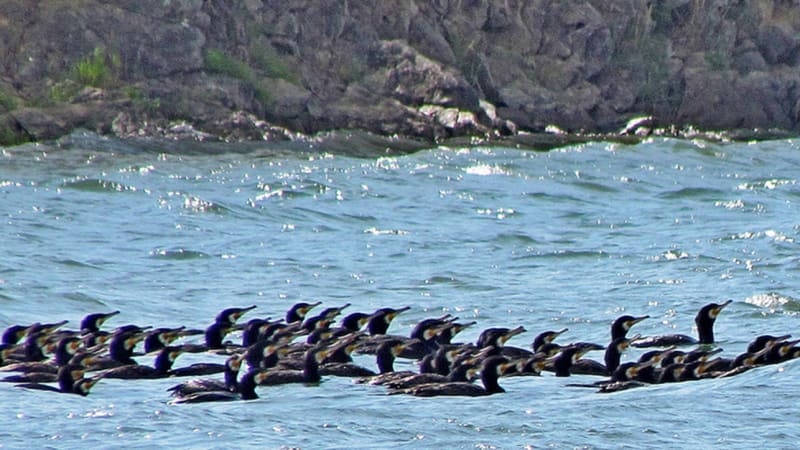 Из личного опыта замечу, что даже не очень большая стая бакланов, численностью всего-то в несколько десятков или пусть в полторы сотни особей, кажется тучей, если пролетают они рядышком. А вот если примерно такая же по численности стая летит вдалеке, где-то у противоположного берега залива, она уже не кажется «громадной»: так себе, небольшое тёмное пятнышко на фоне береговых скал. Если то пятнышко мысленно распределить в пространстве на отдельных особей, как распределены, к примеру, чайки, то бакланы, скорее всего, станут и вовсе малозаметными.