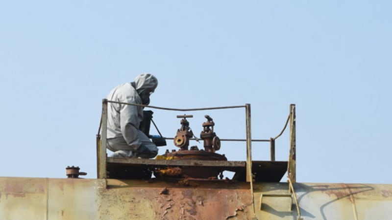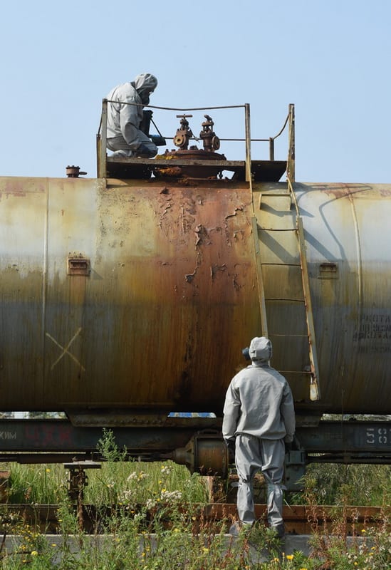 На перетарку ёмкостей, которая должна начаться в ближайшие несколько недель, отведено три месяца. Пока цистерну, которую показывают журналистам, обследуют военные. В том, как два человека в костюмах химзащиты деловито выполняют все необходимые операции, есть что-то успокаивающее: видно, что действуют профессионалы. Но сопровождающая их действия тишина – негромкие переговоры, если они и ведутся, просто не слышны – щекочет нервы не хуже некоторых сцен из сериала «Чернобыль». Те же ассоциации вызывает обязательное обеззараживание, которое необходимо проходить в надувной палатке на выезде с промышленной площадки. «Сказать, что обстановка прямо сильно опасная, нельзя, – успокаивает Вебер. – Но наша основная задача в том и состоит, чтобы предупредить развитие чрезвычайной ситуации. Потому что на сегодняшний день ёмкость стоит спокойная, но никто не знает, что произойдёт завтра».