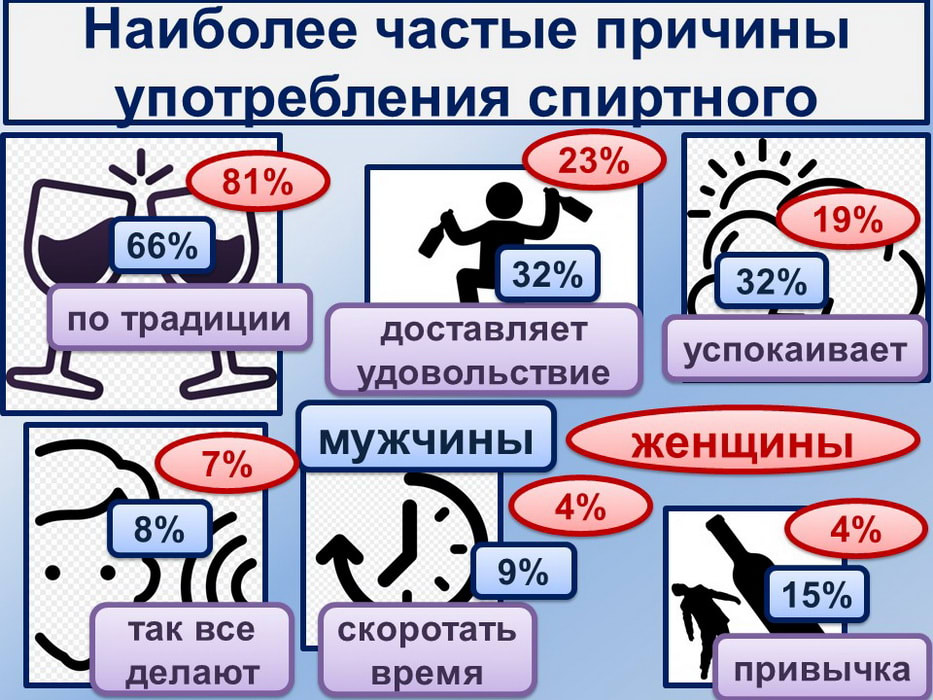 Для приобщения к спиртному есть немало причин, причём каждый выпивающий может иметь не одну причину. Главная из них – традиции, на что ссылаются 73% опрошенных россиян, ведь праздники принято отмечать непременно с бутылкой на столе. Следующие две весомые и почти равноценные причины: это «доставляет удовольствие» и «успокаивает», такой аргумент привели 28% и 25% респондентов. В силу привычки выпивает каждый десятый, с оглядкой на большинство – 7%, столько же с бутылочкой коротают время. Из числа опрошенных 3,3% признались, что нет воли прекратить, а 2,4% считают невозможной жизнь без этого.