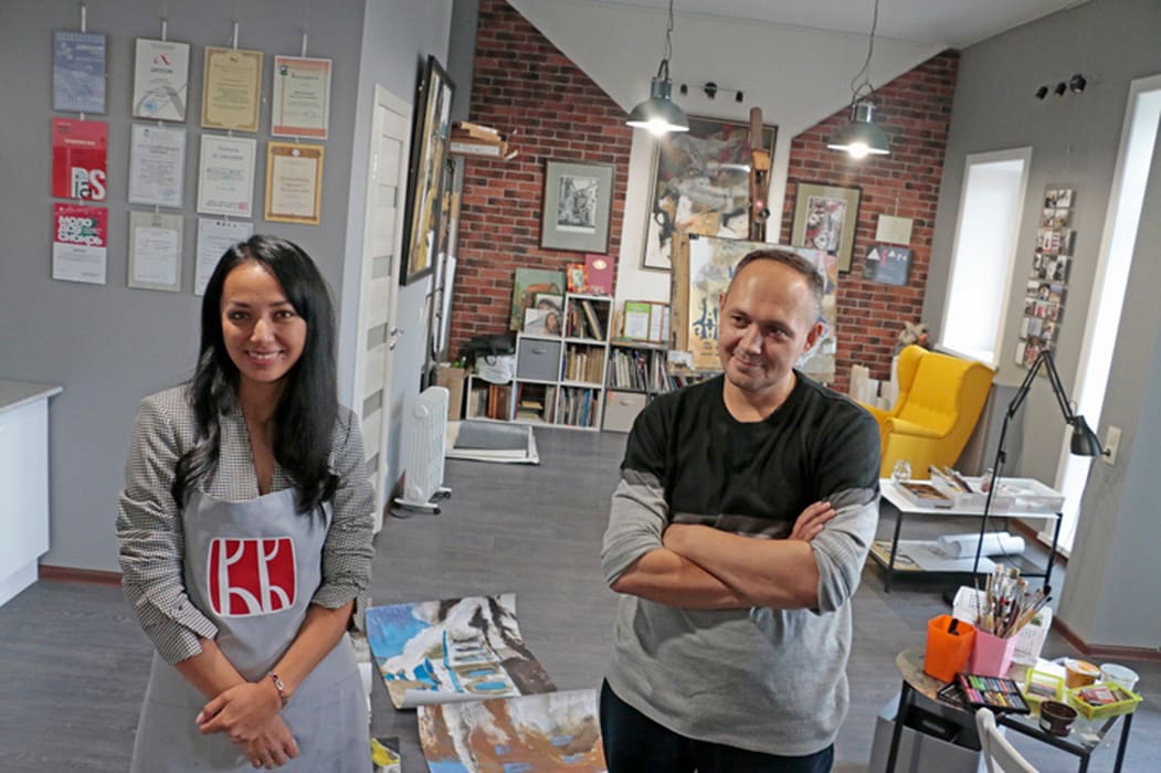 – Хочется по-новому увидеть Иркутск и что-то новое и в себе поймать, – согласен Сергей. – Когда ты творчески «наелся», начинается застой, начинаешь повторяться. И нужен свежий глоток. Когда мы только начинали «Красный квадрат», первые четыре года мы повторялись. В 2011 году мы поехали в Питер и увидели там много нового, резко всё поменялось. Валя работала в печатной графике, сейчас она работает в смешанной технике, в любых техниках, и у неё всё свежо, ветер какой-то, движение в работах. Недавно она попробовала себя в керамике, получилось очень хорошо. Это новая форма, новый поиск, новый язык. Я писал маслом, а сейчас работаю акварелью. Когда ты приезжаешь в город, он сам тебя разворачивает и предлагает своё видение. Город на Неве я вижу через акварель, я потому и приехал из той поездки уже с акварелью». «Действительно, каждый город диктует свои правила, к нему один творческий подход нужен, а к другому городу – иной, – говорит Валентина. – Ты хочешь свою, отработанную технику к городу применить, а идёшь в магазин и покупаешь другие материалы… И всех удивляешь – коллег, искусствоведов… Что с тобой случилось? А это город заставил».