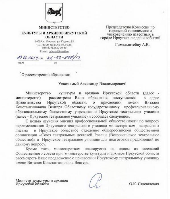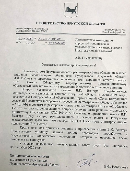Инициативная группа подготовила открытое письмо губернатору Левченко. Смысл тот же – дать возможность иркутским ребятам учиться мастерству актёра в Венгеровском училище. Письмо подписали три народных артиста, три заслуженных артиста, три заслуженных работника культуры, два лауреата Государственной премии России, три академика, несколько профессоров.
