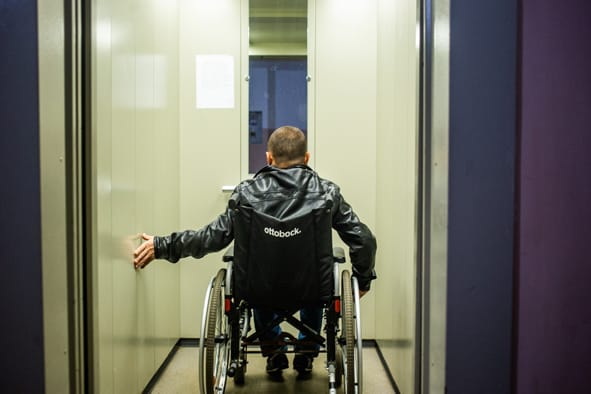 Преодолев лестницу, Макаров оказывается у своего подъезда. Ему нравится здесь жить. Этот дом лучше других приспособлен для колясочников. Около подъезда пологий бетонный пандус с массивными металлическими перилами. Просторный лифт, в который легко заезжает коляска. Например, в больнице лифт старый, коляска не проходит в узкий дверной проём, и её спинку приходится стягивать ремнём.