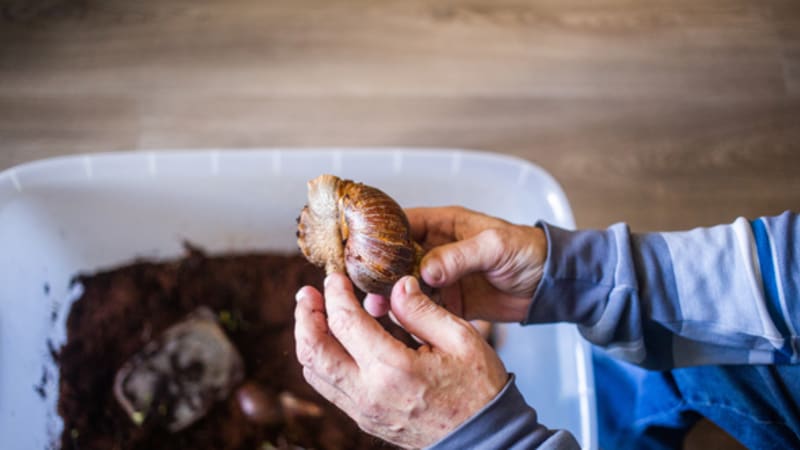 Прежде чем лечь спать, Сергей открывает крышку полутораметрового пластикового контейнера, который стоит в углу комнаты. Из-под крышки вылетает стайка мелких мошек. Контейнер на четверть заполнен специальной смесью земли и молотой скорлупы кокосового ореха. В этой смеси живут пять земляных улиток, каждая с кулак взрослого мужчины.