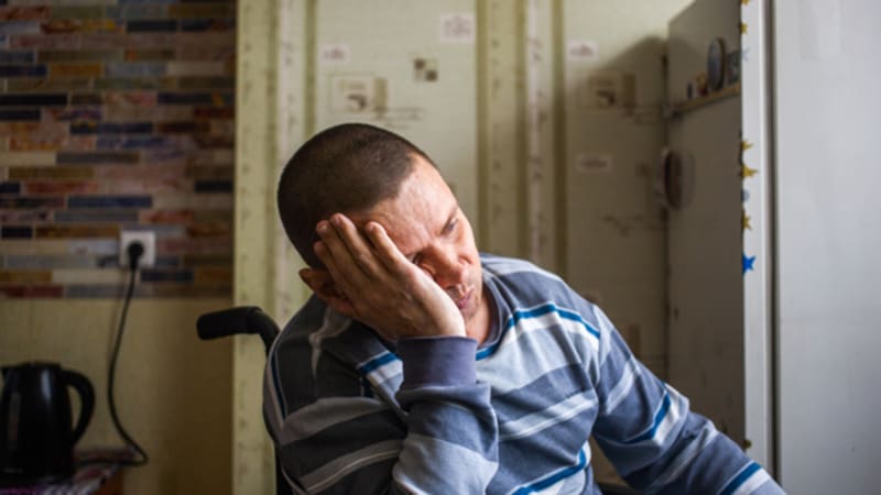 Но Сергей всё равно боится. Ему ещё нужно пройти по коридорам поликлиники. Сейчас люди с коронавирусом идут на приём и сидят в общей очереди. Сергей плотнее натягивает на нос маску, надевает толстые брезентовые перчатки. Колёса у коляски грязные, крутить их приходится руками. «У меня иммунитета совсем нет, – говорит Сергей. – А в больнице все кругом кашляют. Но другого пути нет».