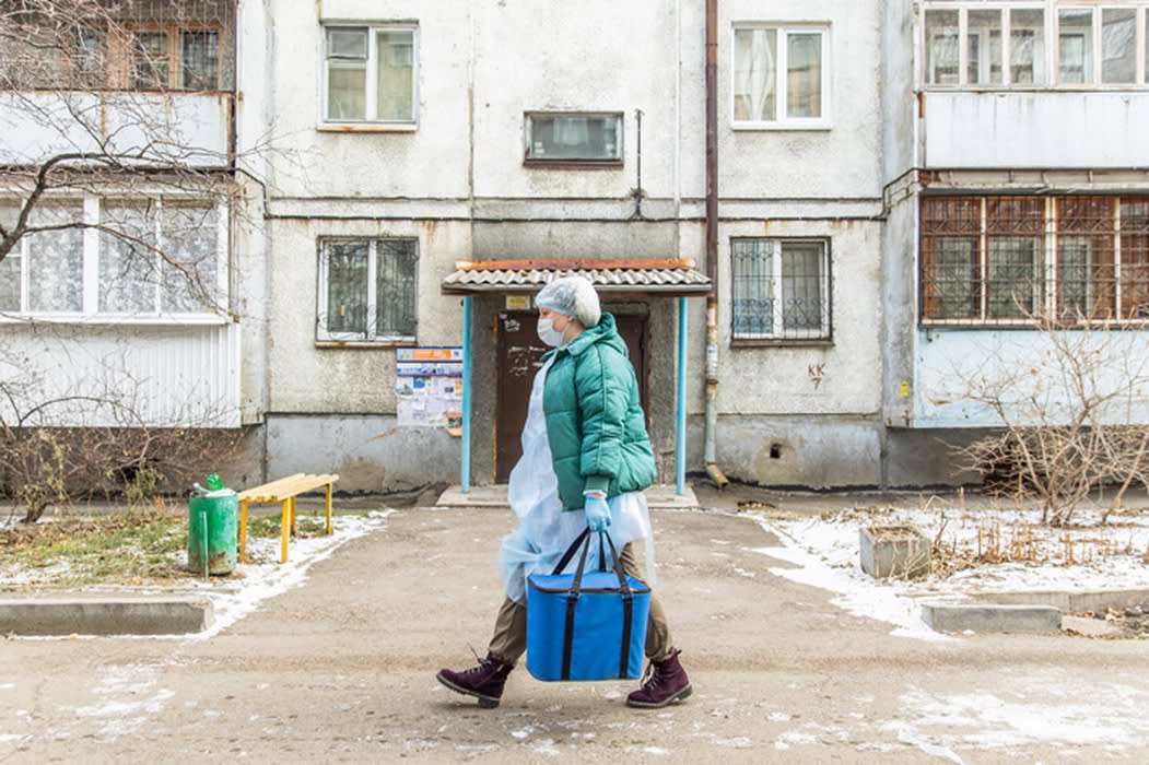 «Я пальто сняла, – объясняет она, – в нём невозможно. Заходишь к пациентам: жарко, я вся мокрая становлюсь. А выходишь потом на улицу – холодно. Костюм этот сам по себе очень плотный, не дышит, в нём всё равно вспотею. И огромный, размера XL, он с меня слетает. Не знаю, как ещё его подвязать, чтобы не поддувало»