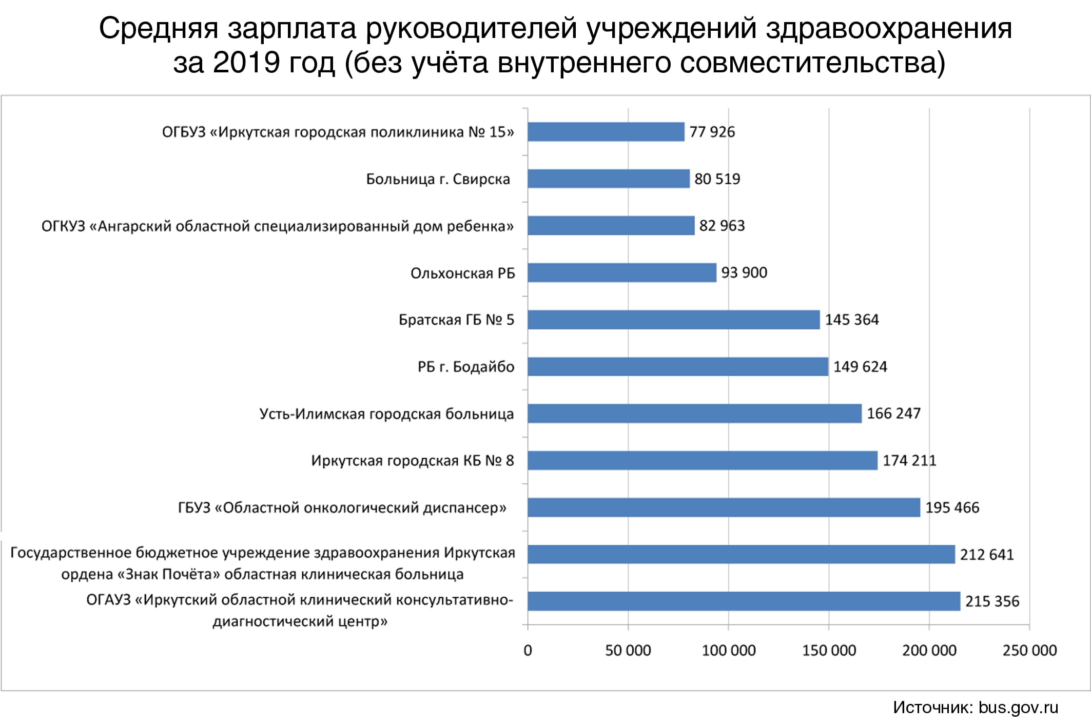 Для сравнения, по данным портала https://bus.gov.ru/, в Иркутской области зарплата у главврачей областных больниц без учёта совместительства колеблется от 88 до 215 тысяч рублей. Самая высокая зарплата (не путать с декларируемым доходом) у руководителя областного диагностического центра – 215 357 рублей в месяц. У главврача областной клинической больницы – 212 641 рублей, онкологического диспансера – 195 467 рублей. У главврача Братской больницы № 5 – 145 365. Недавно мы писали о том, что в этом лечебном учреждении врачам из «красной зоны» приходится по семь раз надевать одноразовые СИЗы.