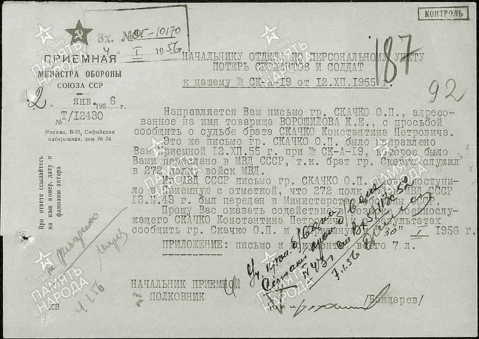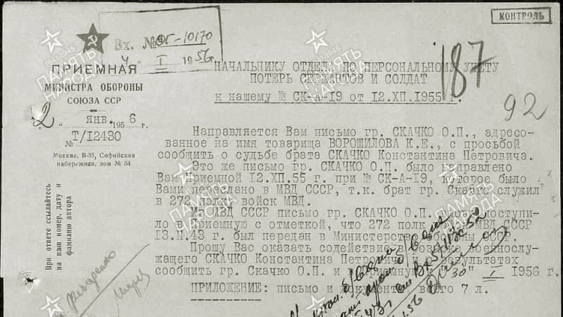 Все предыдущие инстанции были пройдены безрезультатно. Ещё в январе 1952 года Ольга Петровна просила сотрудников Сталинского районного военного комиссариата Иркутска помочь в розыске своего брата. Там ответили, что в имеющихся списках призванных в годы Великой Отечественной военнослужащих – значительную часть документов уничтожил пожар – нет сведений о Константине Петровиче Скачко. По действовавшей в те времена методике стали искать свидетелей, которые подтвердили бы сам факт его призыва. Их показаниями было подкреплено заявление, которое переправили в отдел по персональному учёту потерь сержантов и солдат Советской Армии Министерства обороны СССР. Но из Москвы пришёл тот же ответ: сведений о призыве Константина Петровича Скачко нет. Поскольку того отправили служить во внутренние войска, в военкомате подготовили прошение в Управление МВД СССР по Иркутской области, которое и вручили Ольге Петровне. Но начальник главка в ответе на него сообщил, что сведениями о призванных, независимо от рода войск, располагает военкомат, в который и нужно обращаться. «Я, товарищ Ворошилов, очень устала от этого «хождения по мукам», – сетовала Скачко.