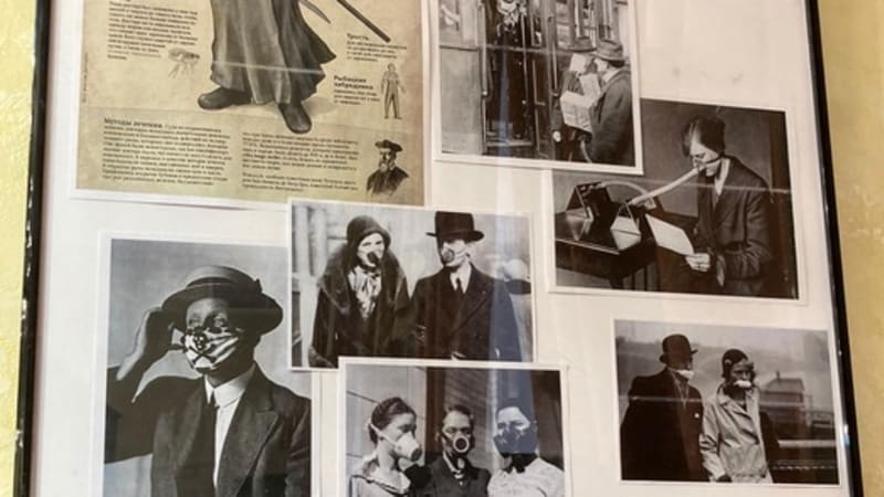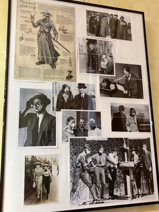 Все предметы – из фондов музея. Можно увидеть, как одевались медики, какие методы защиты от болезней практиковались, что печатала пресса об этом. Вот, например, фотографии медиков в масках, по которым можно узнать, как маска меняла свою форму в разные годы. А рядом – реакция наших современников на эпидемию. Фотографии стрит-арта, портрет Виктора Цоя в маске со словами: «Будь осторожен, следи за собой». Манекены, одетые в современные противочумные костюмы.