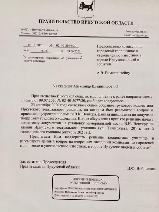 Пользуясь случаем, раз уж вы находитесь в контакте с будущими заявителями, прошу им сообщить, что комиссия по топонимике поддержала инициативу администрации города об установлении мемориальной доски Почётному гражданину области и города Виталию Константиновичу Венгеру на одном из мест его проживания в Иркутске.