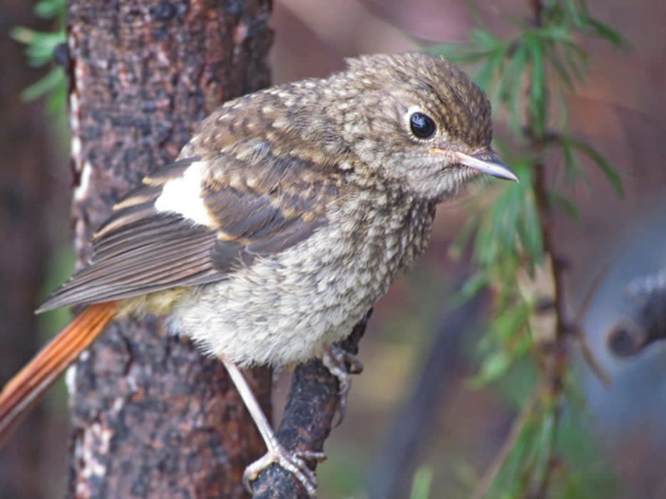 Убедившись, что птенца моё присутствие не пугает, я медленно, без резких движений повернулся к нему всем корпусом, поднял к лицу фотоаппарат. Он в ответ несколько раз махнул хвостиком. Не повилял, как это делают собаки, и не потряс, как трясогузки, а помахал вверх-вниз, как взрослая птица. Я сделал несколько снимков «крупняком». Встал и сделал небольшой шаг к нему. Птенца это не насторожило. Он слетел с ветки вниз, едва ли не под мои ноги, на голую землю, исполосованную корнями деревьев. Вновь взлетел на ветку корявой лиственницы. Цвет оперения у него ещё не вполне сложился для взрослой птицы. И растущие пёрышки пока ещё чуть топорщатся, но треугольные белые «зеркальца» на сложенных крыльях подсказывают, что это птенец горихвостки сибирской.
