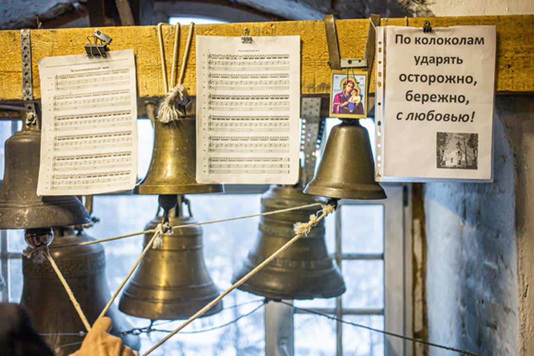 Напротив окна стоит ещё один тренажёр для учеников – с колоколами. «Наша радость и гордость», – говорит Александр. Когда он возглавил школу, тут было только два колокола, со временем он приобретал другие. Один из колоколов отлили для каторжанской тюрьмы в Акатуе, а потом или не довезли до Забайкальского края, или вернули оттуда назад, так он оказался здесь. Другой отдали школе из Михайло-Архангельского монастыря в Ново-Ленино – там он не вписывался в ансамбль. Третий, по легенде, нашли на дне Байкала. Говорят, что там его спрятали после революции, притопили, и он оброс ракушками, а потом нашли, восстановили отдали в храм в Порту Байкал, откуда его вместе с двумя рындами, судовыми колоколами, отдали Ипполитову. Ещё одну рынду ему подарили в Качуге, куда он ездил, чтобы помочь развесить колокола.