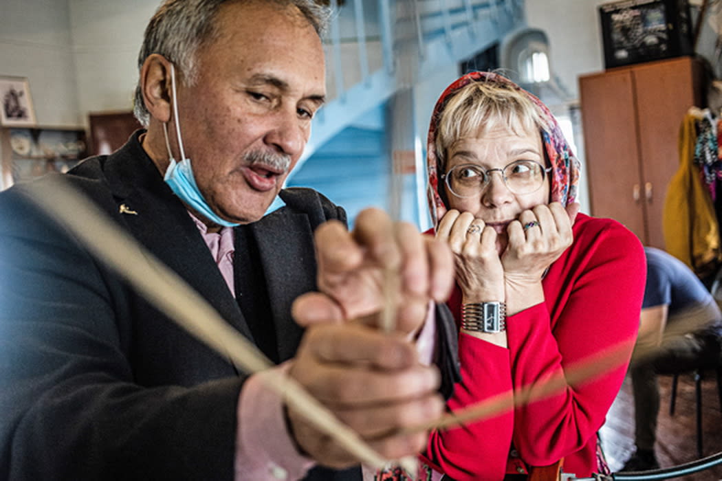 В помещении уютно, светло и поначалу прохладно: обогреватель не сразу начинает работать в полную мощь. Посередине комнаты стоит длинный стол, на котором лежат бумаги, на полотенце стоят кружки и тарелка с печеньем. Чуть дальше деревянная конструкция в форме арки, на ней висят колокольчики. «Это для самых маленьких, – объясняет Ипполитов. – На самом деле это даже не колокола, а поддужные колокольчики для лошадиной упряжки». Когда люди передвигались на лошадях, такие колокольчики были обязательным атрибутом путешествия: они сообщали встречному экипажу и работникам станций о приближении тройки.