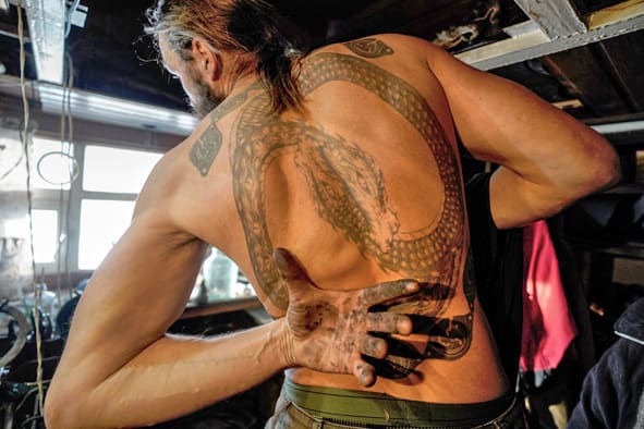 В доказательство мужчина снимает футболку и поворачивается спиной. Во всю спину – татуировка, на которой сплелись кольцами две змеи. Тонкие линии выполнены чётко и ровно. У основания глаз одной змеи виден шрам размером со спичечный коробок. Он не бросается в глаза благодаря рисунку.