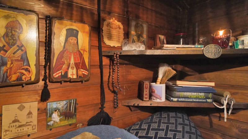 Пахнет клеем, гуталином, кожей. Но все запахи перебивает густой аромат ладана. На лампадке стоит специальный «жучок» из церковной лавки. Пламя нагревает брюшко медной чашечки, на дне которой лежит кусочек ладана. Смола плавится, пузырится, от неё поднимается пахучий белёсый дым. На стенах висят десяток православных икон, две нитки деревянных чёток. На полке стоят книги: Библия, сборник рассказов архимандрита Тихона Шевкунова «Несвятые святые», православный молитвослов.