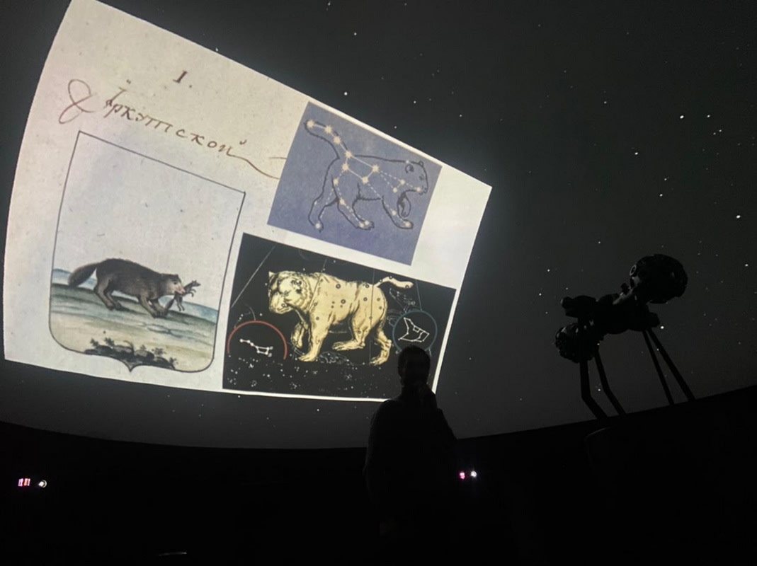 «А на кого похоже это животное?» – спрашивает Меркулов зрителей. «На бабра», – в шутку отвечают из зала. На экране появляется один из первых вариантов изображения герба Иркутска, и сходство символа города того времени с Медведицами становится очевидным. «Но это шутка, – обращает внимание зрителей Меркулов. – Бабр на звёздной карте отсутствует».