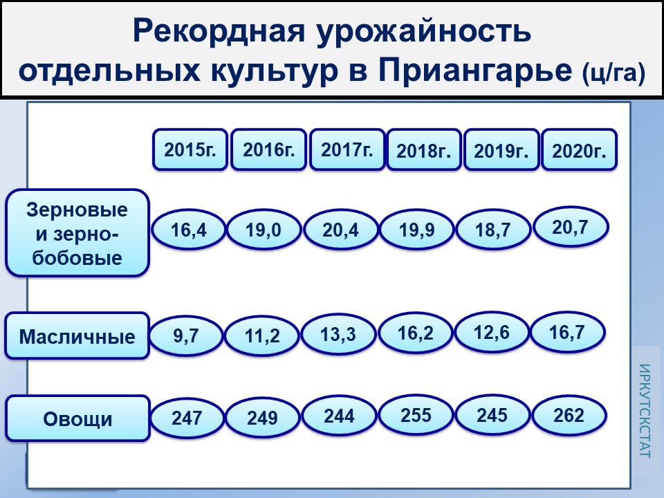 Кроме того, 2020-й оказался благодатным для полеводов Приангарья. Урожай многих сельхозкультур был максимальным за последние несколько лет. Рекордная урожайность зафиксирована на посевах зерновых и зернобобовых (пшеницы, ячменя, гороха), масличных (соя, рапс) и овощей. Из кормовых культур отличились кукуруза на корм (с каждого убранного гектара получено по 235 центнеров) и однолетние травы на сено.