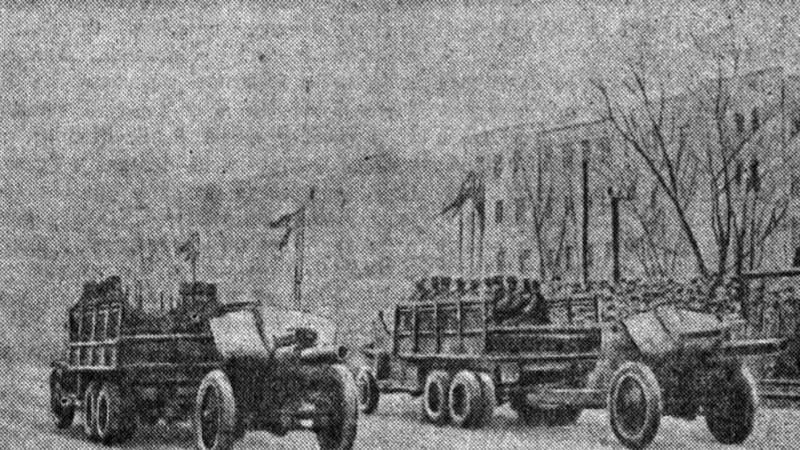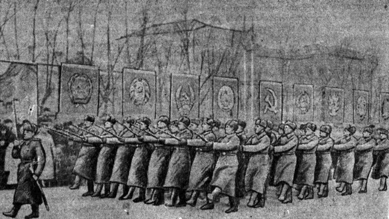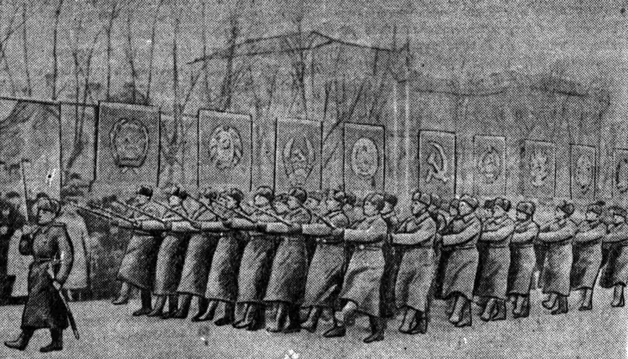 «10 часов утра. Ровными шпалерами на площади выстроились войска. На центральную трибуну поднимаются руководители областных и городских партийных и советских организаций, командиры Красной Армии…