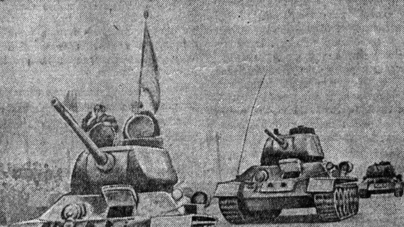 «Подана команда: «Парад, смирно!» От восточных трибун площади верхом на гнедом коне скачет принимающий парад командующий Восточно-Сибирским военным округом генерал-полковник Романенко. Командующий парадом Герой Советского Союза генерал-майор Криволапов встречает его перед трибуной. Рапорт отдан. Генералы направляются к войскам, здороваются с ними и поздравляют их с праздником. Над площадью гремит мощное красноармейское «Ура». Фанфары сыграли сигналы «Слушайте все!». Генерал-полковник Романенко поднимается на трибуну и обращается к войскам с речью. Начинается торжественный марш. Идут советские воины… У многих на груди боевые ордена и медали. Это они прошли с боями от Сталинграда до Берлина, преодолели Хинган, вышли к берегам Тихого океана…»