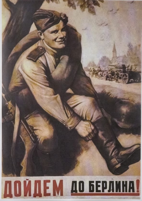 Плакат Дени, на котором довольный советский солдат с помощью трёхлинейной винтовки с пучком штыков выметает из Европы карикатурного нацистского военачальника, сразу напоминает и об авангарде, и о смеховой культуре, сложившейся ещё до Октябрьской революции. Нарисованный в 1945 году, он резко отличается красочностью и оптимистичностью сюжета от агитации начала войны. Эволюция заметна и во время коренного перелома. Очевидно, что в 1941 году нужно было призывать сражаться до последней капли крови, чтобы любой ценой остановить машину блицкрига. К 1943-му, когда была выиграна Сталинградская битва, солдаты уже обещали спасти советских граждан от немцев и уверяли: «Немецкий танк здесь не пройдёт». Кстати, к этому времени аморфный враг приобрёл конкретную национальную принадлежность – на смену статьям о солидарности с угнетённым рабочим классом Германии, который эксплуатируют нацистские вожди, в июле 1942 года утвердилось новое отношение к врагу, выраженное в статье Ильи Эренбурга «Убей немца!». Так осознание тотального характера войны на уничтожение отодвинуло гуманистические идеи на второй план.