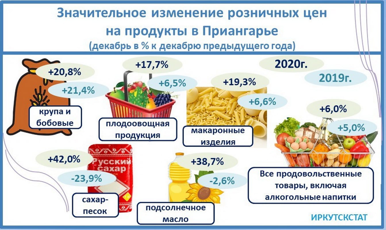 В целом продовольственные товары (включая алкогольные напитки) в Иркутской области подорожали на 6,0% (по России – на 6,7%).