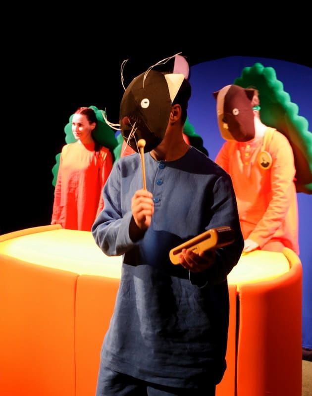 Когда смотришь, как решил вопрос с пространством спектакля Артём Яцухно, понимаешь, что он угадал что-то важное. Так и надо было сделать. Сцена – это обычный стол, декорации прикреплены за спинами актёров – это силуэты крон деревьев. Когда актёр поворачивается спиной – он дерево, когда встаёт лицом – он человек. Надевает маску – большой Кот, или Слониха, или Волчица. Снимает и берёт в руки крохотные куклы – опять человек. Сам Давид Самойлов говорил в 1984 году: «Театр для человека моего поколения и моего способа жизни, воспитания и всего прочего начинался, знаете откуда? От театра двора. Первый театр, увиденный мною, был шарманщик и дворовый Петрушка, уличные акробаты, собиравшие большую толпу. И мне кажется, что этот дворовый театр, мой первый театр, был наиболее впечатляющим». Самойлов, по его собственным словам, любил театр, «где нет лишнего реквизита, тяжёлых декораций, где главное – действие, мысль и характер». Режиссёру и художнику иркутского спектакля удалось добиться этой лаконичности.