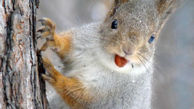 Фотография получилась смешная: белка будто дразнится, язык показывает. А на самом-то деле это вовсе и не язык, а ядрышко миндального ореха изо рта торчит. У меня ещё есть снимок, на котором белка, сидящая на берёзе, грызёт большое красное яблоко. И ничего удивительного нет в том, что сибирская белка лютой зимой экзотическими орехами да фруктами из Стамбула, Сингапура и Тель-Авива питается. Живёт-то она не в глухой тайге, а в цивилизованном городе. Уже не в первом поколении подаяниями кормится. Ей оказалось удобнее и безопаснее жить среди людей, потому что натуральной, сытой тайги в Сибири остаётся всё меньше. Даже там, где деревья пока ещё не вырублены и не выжжены, зверью и птицам с голода помереть можно. Потому что всё съедобное люди в города вывозят. Той же синичке отыскать кедровые орешки или бруснику на городских рынках проще, чем в лесу.