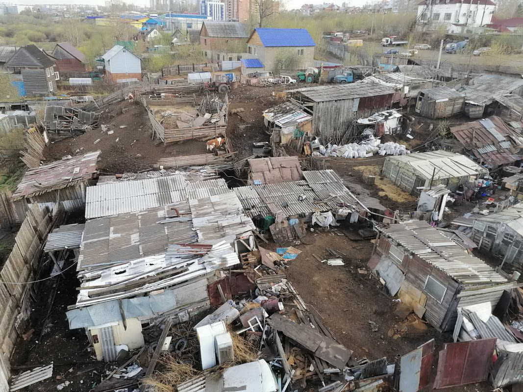 Ржавые металлические ворота перекошены и подпёрты досками, чтобы не падали. В кривом деревянном заборе широкие щели. Местами куски досок выломаны, через дыры весной вылезают маленькие поросята и бегают вдоль по улице. За забором – участок площадью около 20 соток, сплошь застроенный развалюхами, похожими на стайки для скота. Они сколочены из листов фанеры, досок, старых кусков шифера и цинковых листов. Посреди участка навалена куча хлама – старые оконные рамы без стёкол, ржавые металлические бочки, несколько холодильников.