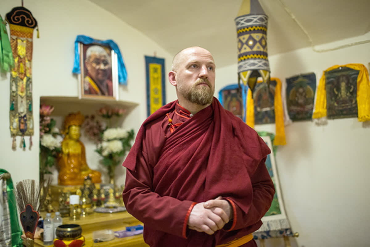 Скромный кабинет Антона-ламы в цокольном этаже дацана украшен изображениями Будды, Белой и Зелёной Тары, портретом настоятеля. И посреди этого красно-золотого великолепия – громкоголосый рыжий сероглазый мужик в красном халате. Это самый экзотичный лама петербургского дацана. Он принял Прибежище – то есть приобщился к учению Будды и буддистской общине – в 25 лет. В дацане он 17 лет, из них пять лет был прихожанином.