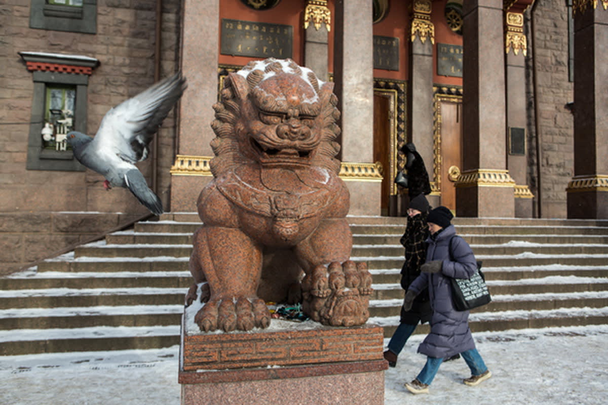 В этом году празднование Сагаалгана – нового года Белой Металлической Коровы – наступило 12 февраля. После хурала (молебна) желающие в беседке дацана привязывают молитвенные флаги удачи – хий морин («коней ветра»). Каменные лев и львица у входной лестницы дацана собирают щедрую дань. Под их лапами блестят монеты, шуршат пачки печенья и конфеты. Львице кладут пожертвования желающие иметь детей, а мечтающие о карьере и власти оставляют подношения у льва. Кучки примерно одинаковы. Двери храма всегда смотрят на юг. Потому что на севере – алтарь.
