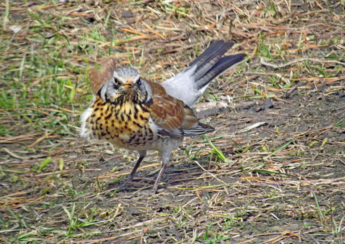 Сделав несколько кадров синицы под холодным дождём, занялся я делами хозяйственными и не заметил, когда нескончаемый дождь закончился. Ветерок уже и капли с веток сбил, и даже траву пожухлую прошлогоднюю поверху обсушить успел. И скачут по той траве дрозды-рябинники. Не один дрозд, не влюблённая парочка, а приличная такая компания разбрелась по участку. Больше десятка. Ищут что-то. Поднимают с земли клювом и отбрасывают в сторону листву прошлогоднюю, плоские кусочки коры, шишки сосновые, другой растительный мусор и смотрят, склонив головы набок, как курицы. Иногда склёвывают что-то, а скорее кого-то, кто там прятался. Это только для нас с вами всё, что оттаяло весной на участке, растительным мусором называется. А для птиц – живой и естественный мир, наполненный пищей и строительным материалом для гнёзд.