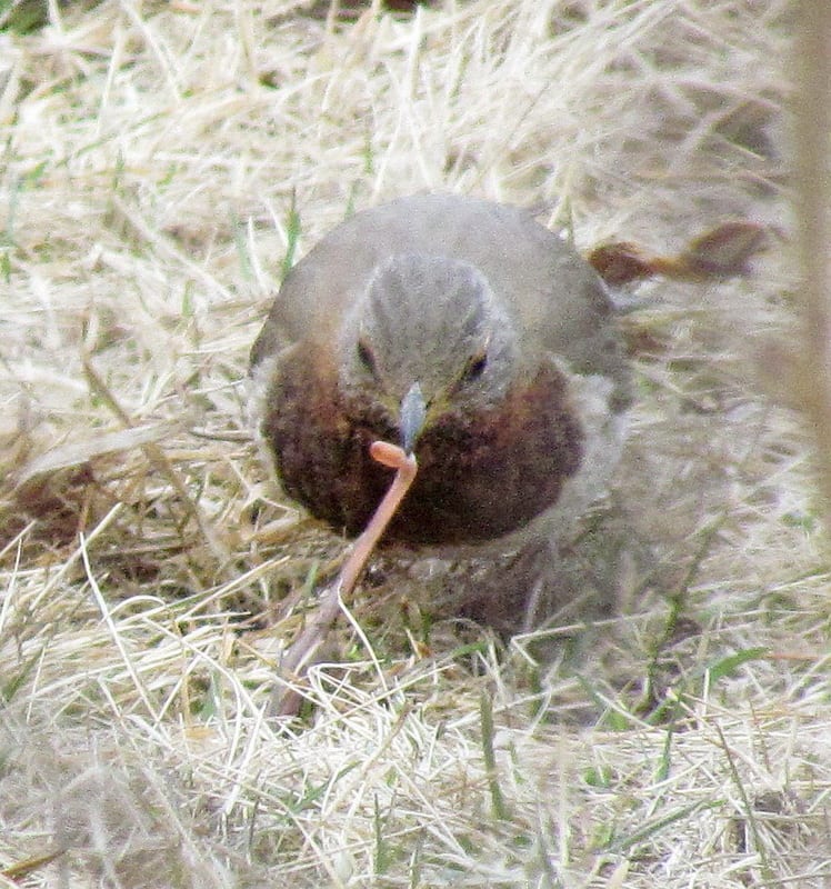 Один из дроздов, отбросив довольно крупную щепку, тут же вцепился в то, что под ней увидел. Птица оказалась далековато для хорошего качества снимка, но фотоаппарат в этот раз сработал вовремя, и уже на снимке я увидел в клюве счастливчика крупного дождевого червяка. «Ну, конечно, как тут не станцевать-то», – порадовался я за птичью удачу.