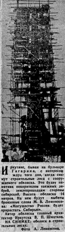 Между тем в памяти иркутян, исключая, конечно, молодое поколение, и сегодня остаётся одна из ярких достопримечательностей города второй половины прошлого и самого начала нынешнего века – также конусовидный четырёхгранный обелиск, возвышавшийся на набережной Ангары в створе улицы Карла Маркса, который многие называли шпилем. Вот как 19 августа 1964 года, поместив фотоснимок загадочной стройки, газета «Восточно-Сибирская правда» анонсировала его предстоящее открытие: «Иркутяне, бывая на бульваре Гагарина, с интересом ждут того дня, когда снимут строительные леса с сооружаемого обелиска. Это памятник покорителям таёжных дебрей – землепроходцам стороны сибирской. Высота обелиска 14 метров. На нём выбьют бронзой слова Ломоносова: «Могущество России будет прирастать Сибирью». Автор обелиска – главный архитектор Иркутска В.П. Шматков».