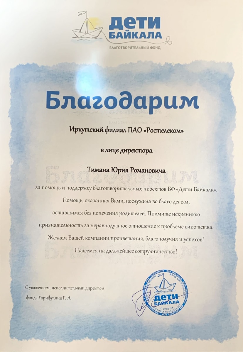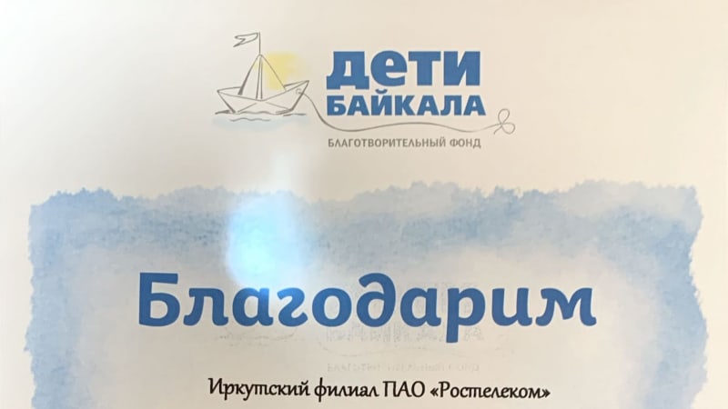 «Ростелеком» получил благодарность руководства благотворительного фонда «Дети Байкала» за поддержку и неравнодушное отношение к проблеме сиротства. Компания систематически оказывает материальную помощь на создание видеоанкет для детей-сирот.