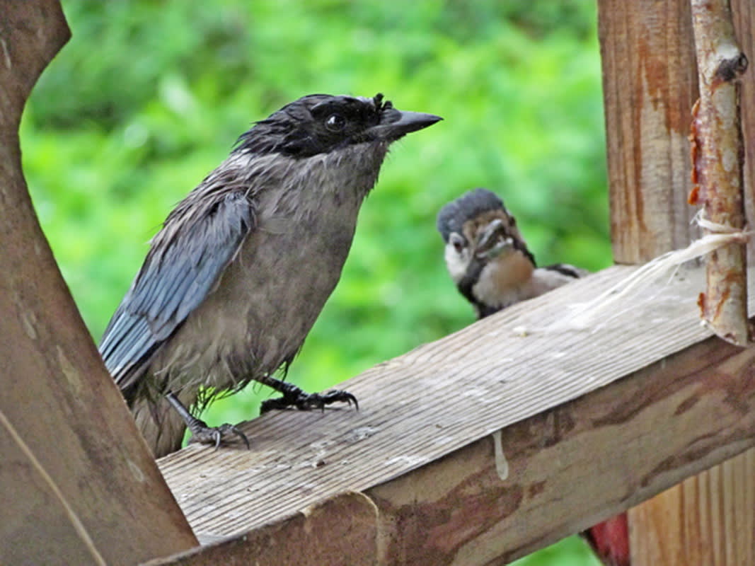 На перилах между кормушкой и Федей будто из пустой шелестяще-моросящей пустоты образовалась… голубая сорока. Промокшая до последнего пёрышка, холодная и наверняка голодная. Скорее всего, она в буквальном смысле «с неба свалилась». Надеялась перекусить на знакомой кормушке. Увидела сверху Федю и решила, что никакой опасности быть не может, если дятел спокойно работает. Человек с чашкой кофе и фотоаппаратом, сидящий в условной глубине узенькой террасы, оказался для неё пугающей неожиданностью. И сорока исчезла так же внезапно, только бесшумно. Я не успел даже расправленные крылья увидеть. Она будто растворилась в нескончаемом дожде. Как привидение.