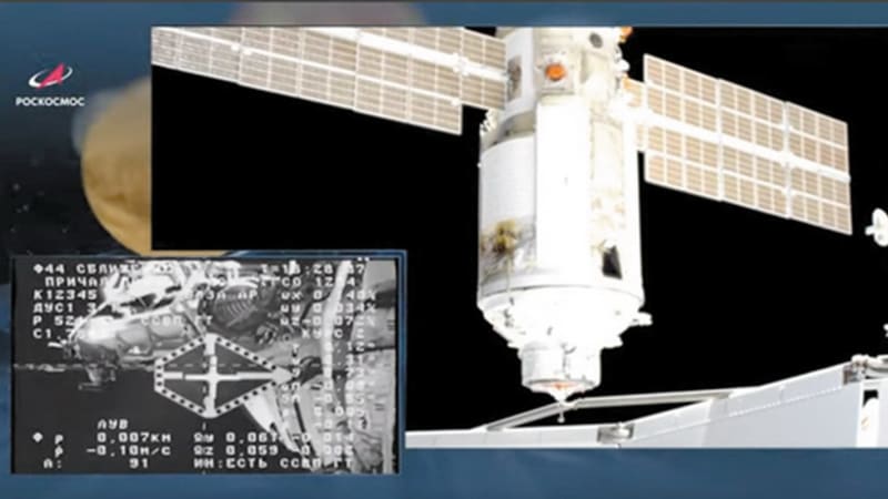 – Дальше всё пошло идеально – автоматика вела «Науку» к станции, постепенно включались двигатели, подправляя движение, постепенно падала скорость, и незадолго до стыковки скорость была уже около 10 см в секунду, – рассказывает Язев. – А потом появилась картинка с самой МКС, с американского модуля, очень хорошего качества. И нам было видно со стороны, как медленно и изящно подходит «Наука» к станции, как автоматически включаются двигатели, возникают вспышки по бокам, когда модуль чуть-чуть подправляют, чтобы стыковочные узлы могли соединиться с точностью в несколько сантиметров. Когда осталось метров восемь до стыковки, модуль начало снова покачивать. Руководитель полёта сообщил на МКС Олегу Новицкому около 21.27 минут: «Олег, давай, переходим». То есть управление должно было перейти от автоматики к космонавтам. Буквально через несколько секунд была новая команда: «Подожди». Автоматика всё выправила! И получилось, что до самого касания автоматика привела модуль куда нужно.