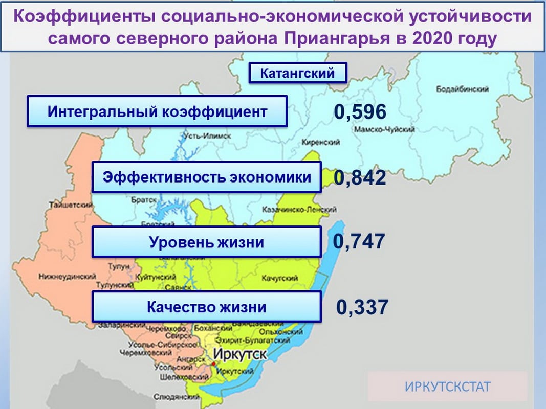 Катангский район трижды (в 2017–2019 гг.) был единственной территорией Приангарья с достаточно высоким интегральным коэффициентом (выше 0,6). Но в 2020 году отрицательное изменение эффективности экономики и качества жизни снизило общий результат до 0,596, и район перешёл в группу со средним уровнем, заняв в ней первую позицию, вторым и замыкающим в этой группе стало МО города Бодайбо и района с итоговым коэффициентом 0,45.