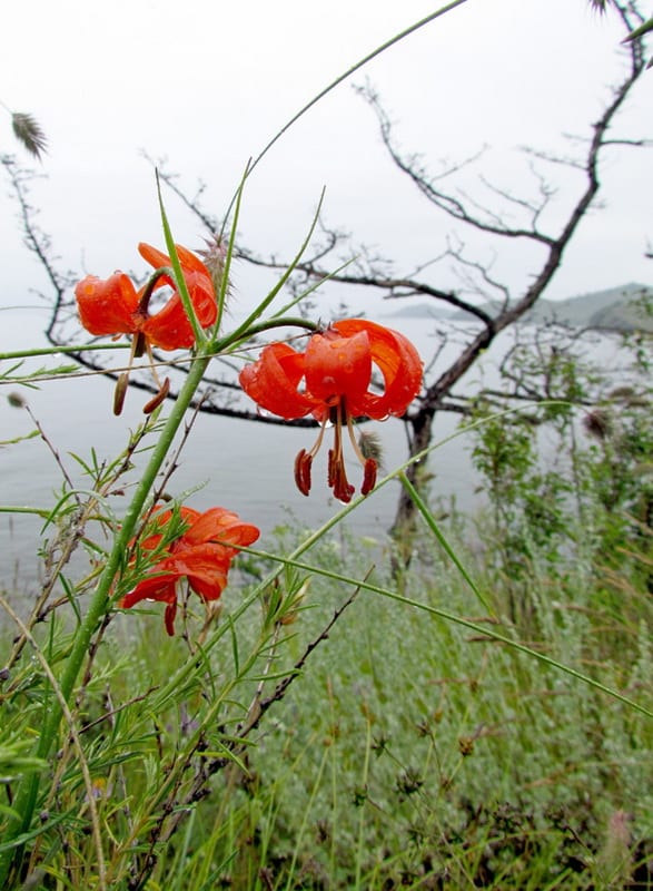 Перечисленные и очень многие не названные в этих заметках растения продолжают жить и здравствовать на берегу Малого Моря между бухтами Мандархан и Зуун-Хагун. Здесь они остаются в хорошем состоянии и в достаточных количествах. Даже лилия карликовая (она же лилия малорослая, лилия тонколистная, лилия узколистная и, наконец, саранка красная), за которую я переживал больше других, порадовала не только броской красотой, но и своим количеством. Ещё в 1975 году это растение было занесено в Красную книгу СССР. К настоящему времени оно числится уже более чем в десятке Красных книг сибирских и дальневосточных регионов как вид, сокращающий численность. В Красной книге Иркутской области, одним из составителей которой является Вера Барицкая, главными лимитирующими факторами, несущими опасность существованию вида, названы хозяйственное освоение территории и сбор цветущих растений на букеты, что ограничивает семенное размножение.