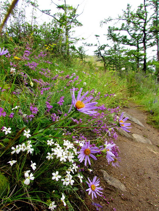 Бугристое степное плато, поросшее отдельными деревьями и небольшими группами лиственниц причудливой формы, полого спускается к обрывистому берегу озера. Море цветущих трав в течение всего лета. И не какого-нибудь привычного бурьяна, которым обычно зарастают брошенные поля и огороды, а цветущих трав удивительной красоты, семена которых хочется собрать, чтобы посеять на даче или на газоне у своего дома в городе. Проблема не только в том, что не все травы, растущие на берегу Малого Моря, приживутся на даче и уж тем более в загазованном городе, но и в том, что не всякое растение на искусственной клумбе будет смотреться так же натурально, как в дикой природе Байкала. Здесь в сочетании с эдельвейсами, к примеру, даже кустики полыни смотрятся красиво, потому что естественно.