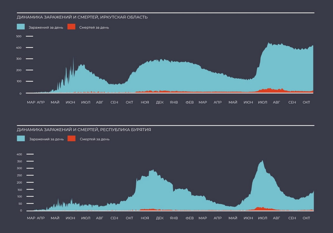 Согласно официальным заявлениям, Иркутская область в июле почти две недели занимала третье место по суточной смертности пациентов от ковида. Выше были только Москва и Петербург. Причём это не в расчёте на одного жителя, а в абсолютных величинах.